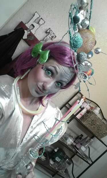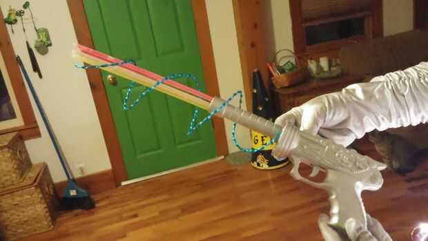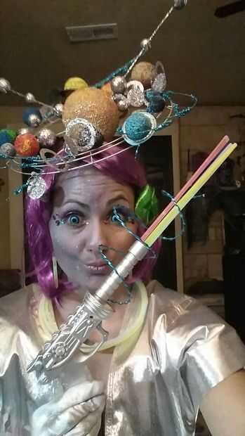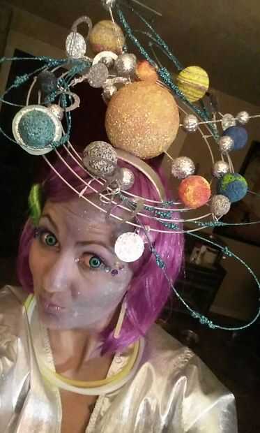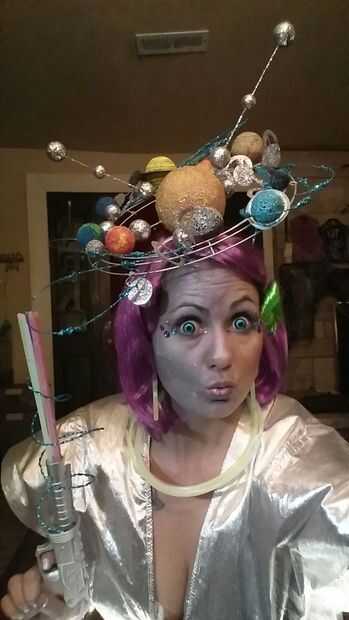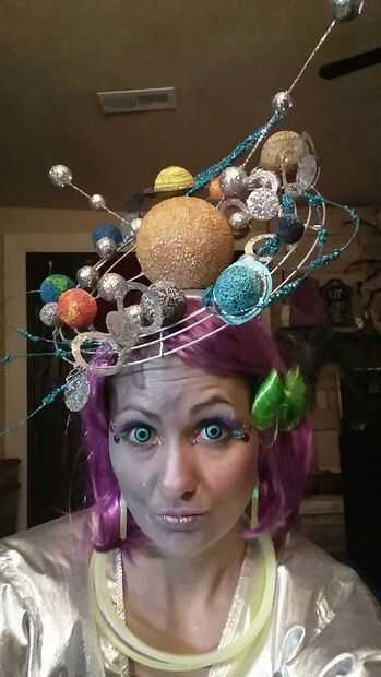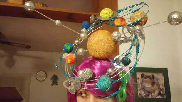 Para la pieza central del sistema solar, yo llevo una corona de alambre y adjunto bolas de icopor en diferentes tamaños, comprados en un paquete de la variedad del árbol del dólar, que de la mano pintaron para parecerse a todos los planetas y el sol, así como un montón de lunas. Os adjunto la corona a un handband con alambre, que era cómodo desde que tuve el Marciano morado al estilo bob peluca. Tomé una pistola juego de árbol de dólar y aerosol pintado plata y pegado en un aplicador de glow stick (la gran idea de la abuela!) con cable espiral en un espiral buscando pistola de rayos alrededor de los palillos del resplandor. Para mis botas de espacio, simplemente compré algunas rodillas botas al ejército de salvación y aerosol pintado plata, así que se veía muy bien con mis polainas metálicos turquesa que me dieron en línea!