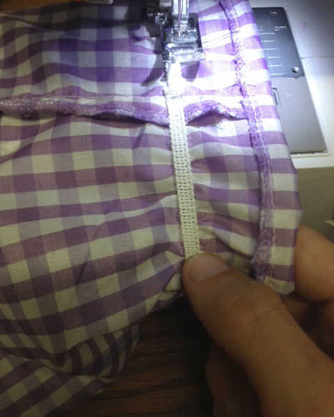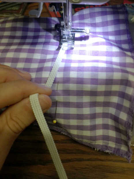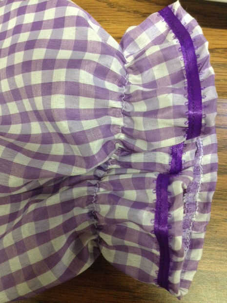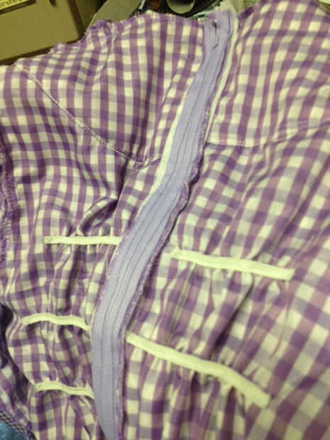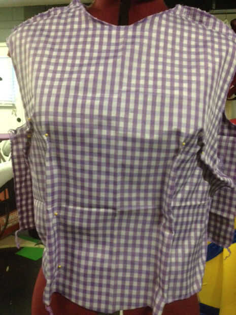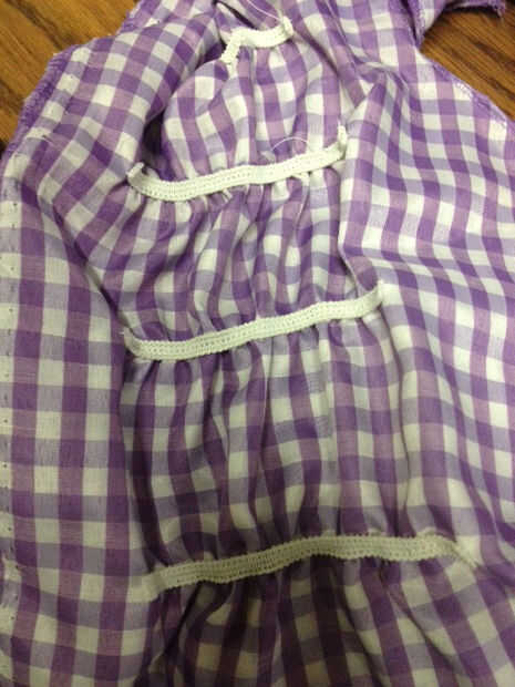 Empiezo con la parte delantera de la blusa y los dardos a la forma de hacer cabe cada vestido al tamaño general de la bailarina. Yo haría más medida, salvo que nuestros intérpretes cambian durante todo el año, por lo que cada uno de nuestros trajes tienen que caber una variedad de formas/tamaños de cuerpo. Para resolver este problema, comencé a añadir las tiras de elástico en la espalda para recoger y pueden entonces estirarse para caber quien lleva o tire de ella en más de los bailarines más. (Verás las tiras elásticas en las fotos). Yo a coser mientras tira los elasticos y reunirá a la tela como va. La máquina hace la mayor parte del trabajo para usted.