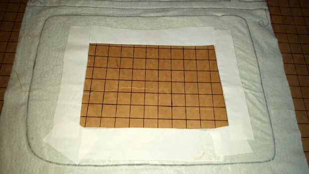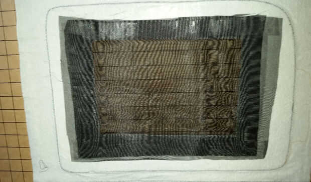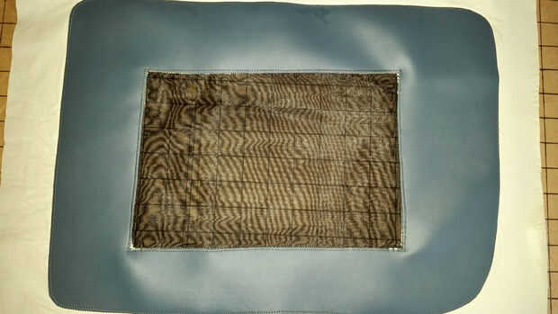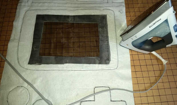Mi hijo quería que su rostro se oculta detrás de la pantalla utilizando la misma red negro que usé para ojos de traje de espía contra espía de su último año. Planchar HeatnBond Lite tiras en el interior los bordes de la pantalla recortada, luego cuidadosamente planchada en un cuadrado de tela negra. Entonces repetí el proceso con otro cuadrado de malla becaust 2 capas creadas un efecto de pixelado. Entonces cosido alrededor del borde para fijarlo.