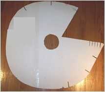 9 en el borde recto del círculo, que se extiende desde la línea extendida en el paso 4, 6 ¾" desde el mismo borde de la línea extendida, cortar un 2" x 1/4" corte perpendicular a la arista exterior del gran círculo. Corte una idéntica abertura 6 1/8" abajo de la primera. Luego corte una raja 9" de la segunda ranura.