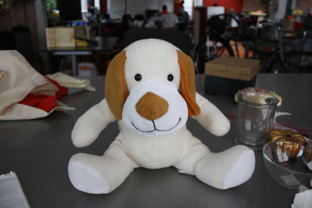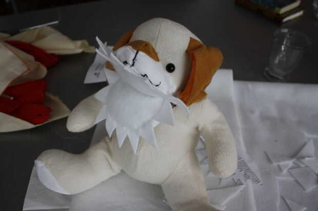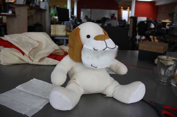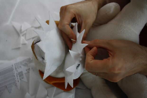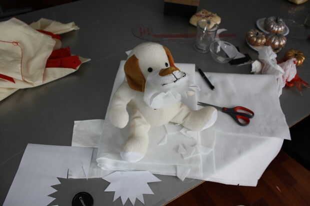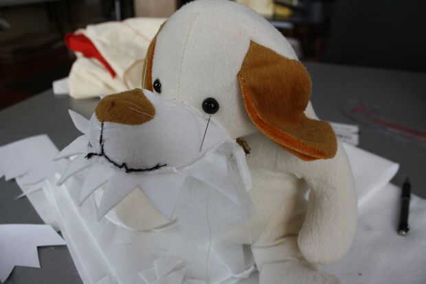 Aquí, he cortado la boca del perro, y cosida a mano en fieltro cortada en forma de dientes.