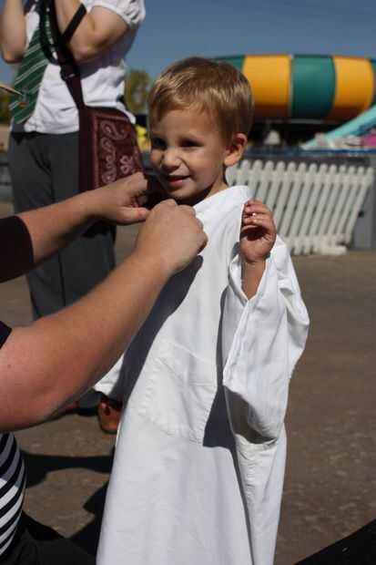 La sotana entonces se ata alrededor de la cintura para formar frunces vestido-como usar la cuerda azul.