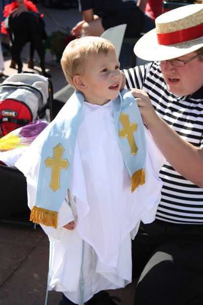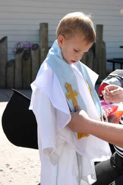 Para la estola, se utiliza hacer un rectángulo de tela azul y flecos cosido en los extremos (aunque usted podría caliente pegue demasiado). Entonces nos planchada en las cruces. Se llevó a cabo en el lugar adecuado con alfileres en los hombros.