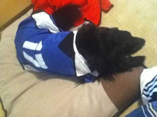 ahora es turno de Jersey el modelo. Ella es mucho más tolerante de ropa de Dexter.Me tomó una hora y media para hacer este traje y pasé $15 para comprar la espuma de artesanía. Todas las otras cosas que compactarse de alrededor de la casa.Si usted qu