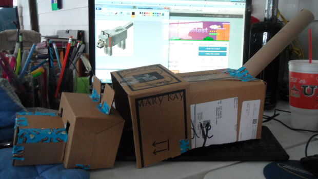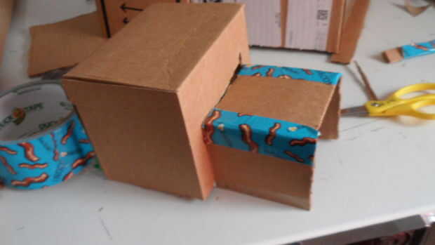 Recorta dos más cuadrados de cartón y cinta adhesiva encima de la cabeza.