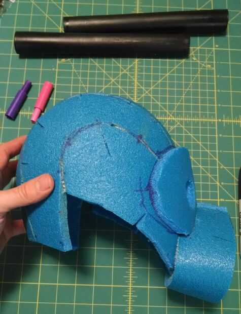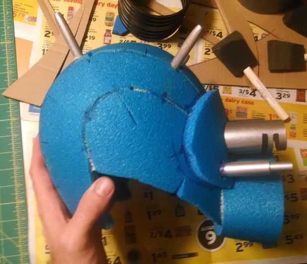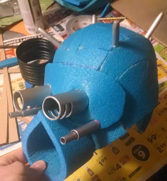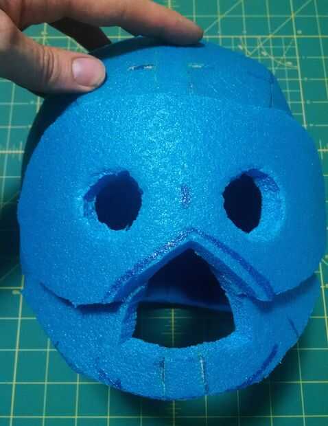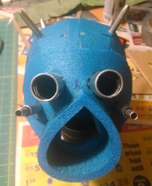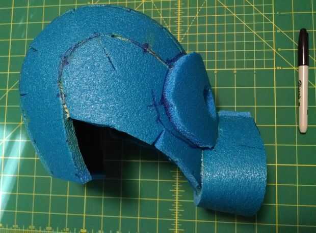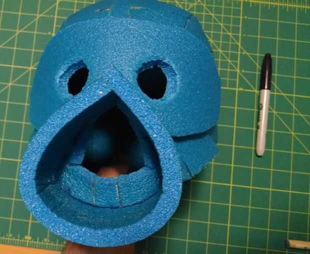 Los ojos en el casco eran un poco apagado y demasiado grande. Asi que me hice una mascarilla para cubrirlos y para poder cortar los agujeros para las extensiones de ojo. Usando la espuma azul forman la boca así. Los dos pegados con cemento de contacto, luego se trasladó a los pedacitos de plata.