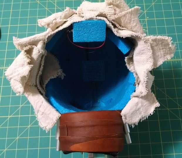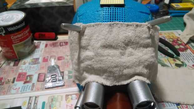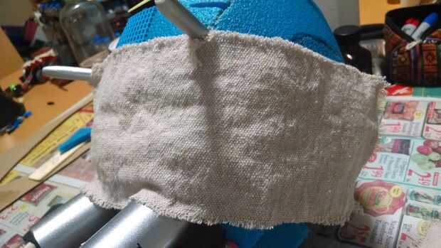 Esto fue todo encolar con E6000 ya que no quiero el cemento de contacto para mostrar a través de. Corté un agujero en el paño para el ventilador. Debo haber hecho estas tiras más largas en cuanto a crear una mejor cobertura para el cuello.