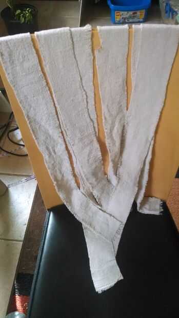 Corté tiras de ancho para hacer una base que cubre antes de trasladarse a tiras pequeñas. Las tiras se hicieron fray la tela alrededor de mis manos y tirando de los hilos en el borde.