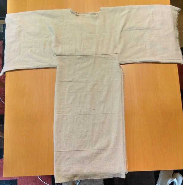 Usando a la tela no teñida, había seguido más o menos los pasos en el sitio original. El traje es básicamente dos rectángulos cosidos juntos. Uno de los brazos, el otro por la cintura y piernas. Los brazos deben ser doblados sobre y corte un agujero para que la cabeza caber a través de. Las piernas son un tríptico que luego se cose en el centro de los brazos.