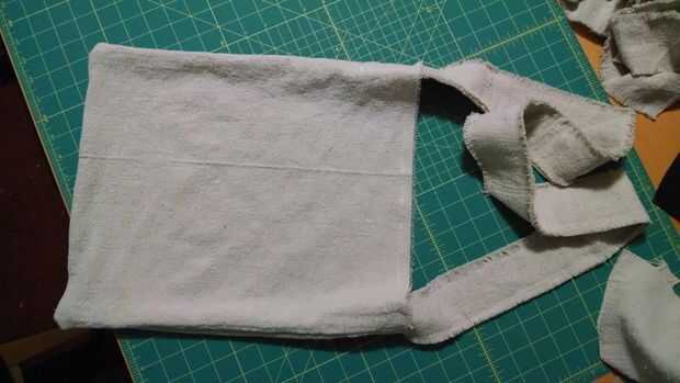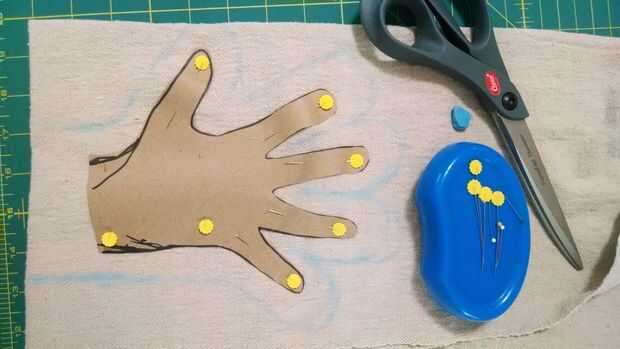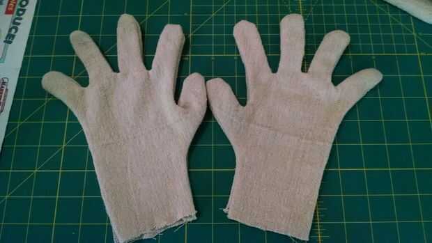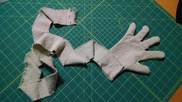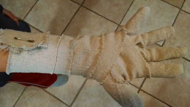 Los guantes eran sólo un rastro de mi mano de hijos en una plantilla. Luego traza sobre la tela teñida con subsidio parecen. Que cortar cuatro piezas y dos cosieron. Después de doblar adentro hacia fuera, salieron bastante bien. Luego até una tira de la tela para cada guante para entonces podríamos envolver su brazo. Utiliza un perno de seguridad para contener la envoltura.