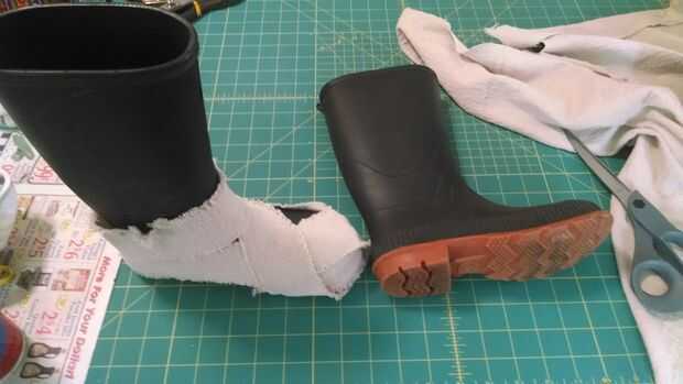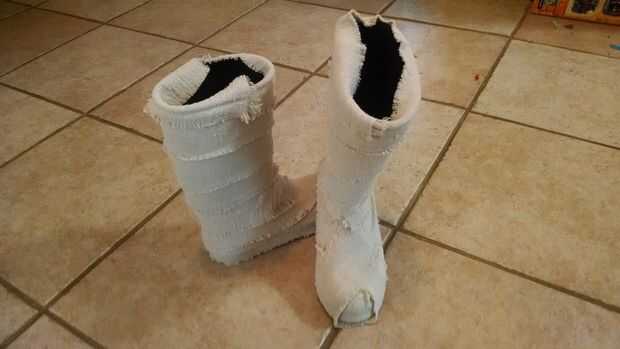 Las botas fueron envueltas con tiras de tela teñida, pegado a la bota con pegamento E6000. Un par a tuve que cortar y pegar a la tela con pegamento de tela fusión.