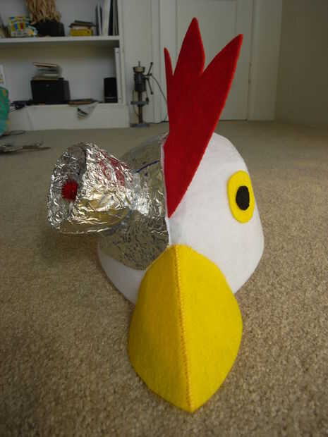 me invitaron a una fiesta de halloween con temas Sci-Fi y mientras pude pensar en un montón de personajes de ciencia ficción, no podía pensar de cualquiera quería o podría ser. Mi amigo y yo tenía un traje que hace parte y todavía no tenía ninguna inspiración para personajes de Sci-Fi, así que hice un sombrero de gallo. Pero a los pocos días tuve la inspiración: Robot Chicken! No es ciencia ficción bastante, pero estaba lo suficientemente cerca. Así la mañana de Halloween que empecé mi nuevo traje de Robot Chicken.