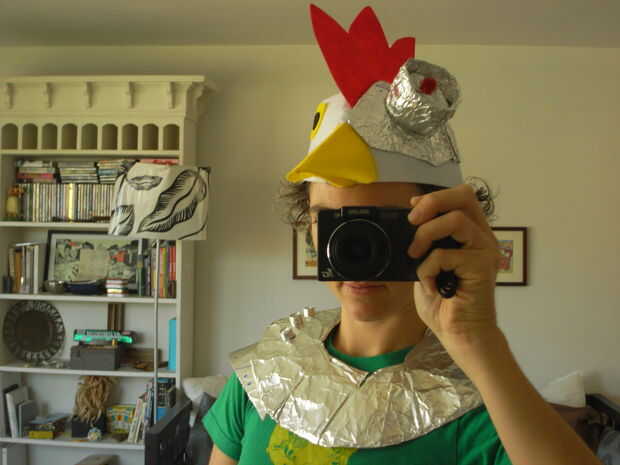 Si estás haciendo pollo Robot en lugar de sólo un gallo regular, ahora es el momento también haría que el robot de la mitad de la cara. Yo sólo libre-formó de hoja de lata, la parte inferior de una botella de agua y un rojo brillante hors d'oeurve pincho cosita que recogí de un año por capricho y nunca han usado. No importa lo que hacer como es rojo (como lo es un ojo láser). La sujeté con una pistola de pegamento caliente.