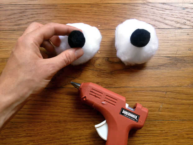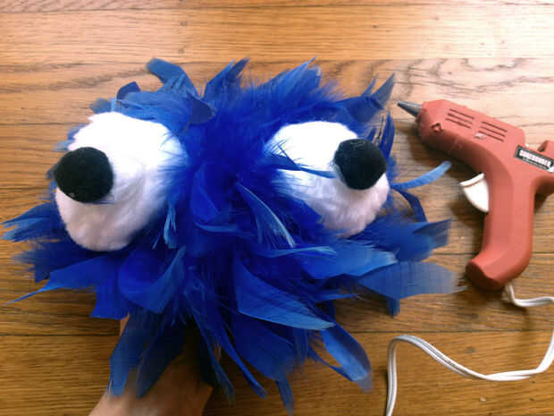 Esta parte es SUPER fácil. Pega tus pompones juntos para hacer que los ojos, luego pegar en la pinza de pelo de pluma y listo! Lo único a tener en cuenta aquí es cómo sus ojos se orientan en relación a su clip. Si va a sujetar el clip sobre la cabeza con su pelo hacia atrás, desea que el clip sea paralelo en línea con los ojos.