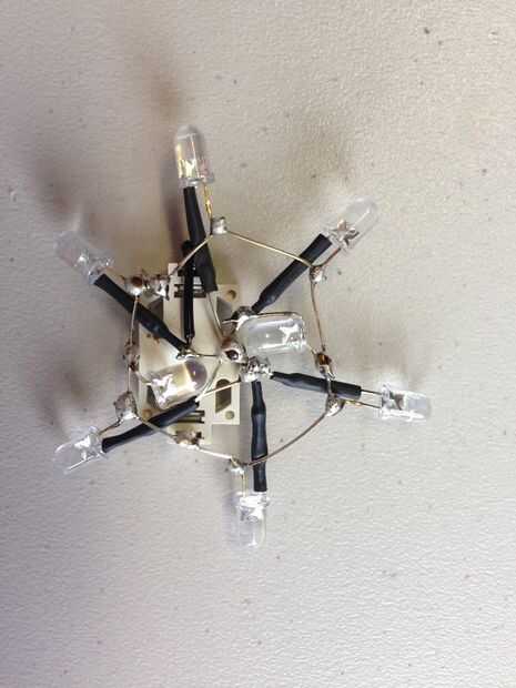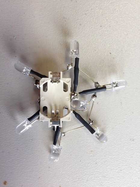 Ahora fije soldadura al portapila para los LEDs. Hiciste que deba usar un poco pequeño de alambre de desecho para hacer una de las conexiones. Lado positivo (+) a los ánodos. Lado negativo (-) a los cátodos. Ahora debe tener un soporte de la batería soldado a seis LEDs. Si quieres dejar aquí tu circuito se realiza esencialmente.