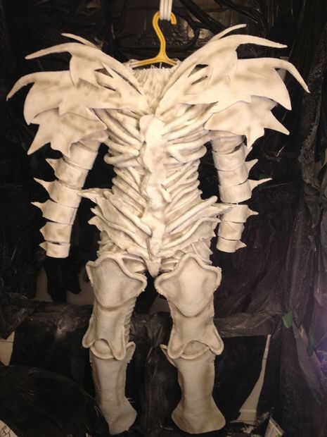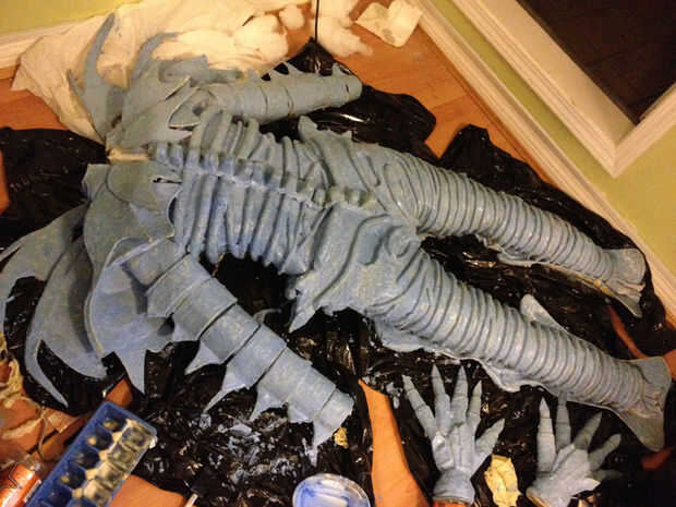 Ahora es el momento para pintar! Primera capa de su traje de látex con pintura PAX. Esto evitará futuras capas de pintura se agriete. Ahora, no tenía que pintar mucho PAX, así que mezclé pintura blanca de PAX, pintura azul, pintura acrílica blanca y agua. Yo con dos capas de esta mezcla (azul) una esponja sobre el traje. Nunca, nunca intente aerógrafo pintura látex/PAX; va a arruinar tu sistema.
