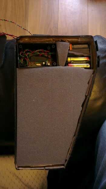 Así que en primer lugar tuve que coincida con el compartimiento por lo que parecía el arma vivienda completa con la cubierta de la tapa. He insertado mi caja de vivienda mi circuito de Arduino y entonces las baterías para juzgar cuánto espacio que necesitaría. Cortan el exceso forma necesaria en espuma y empujado en su lugar.