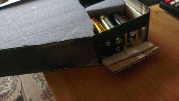 Para el compartimiento del arma de la energía motor necesitaba una batería de 9 voltios y para encender el LED y el casco motor necesitaba 4 pilas AA. Esto era considerada cuando fui para construir mi vivienda.