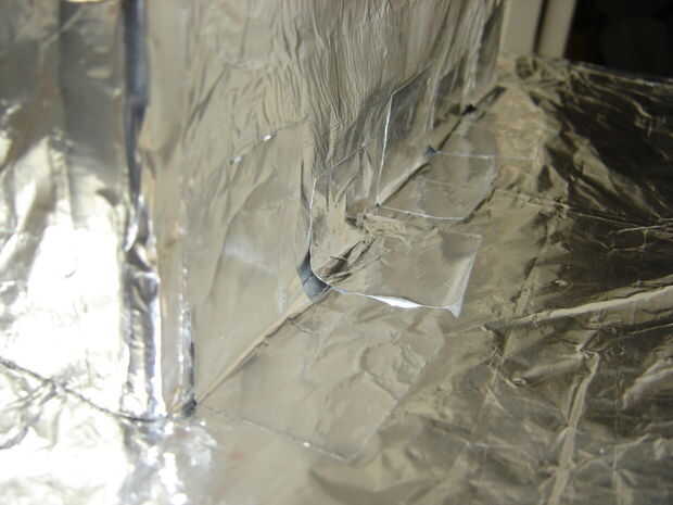 Con la cabeza en posición vertical, até cinta aluminio tenso en la parte exterior de la parte posterior de la cabeza. Mover la cabeza a la posición abierta, até cinta tenso al interior de la parte posterior de la cabeza. La bisagra sostiene muy bien si cinta fuertemente.