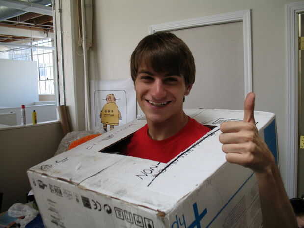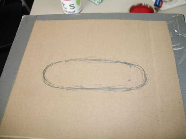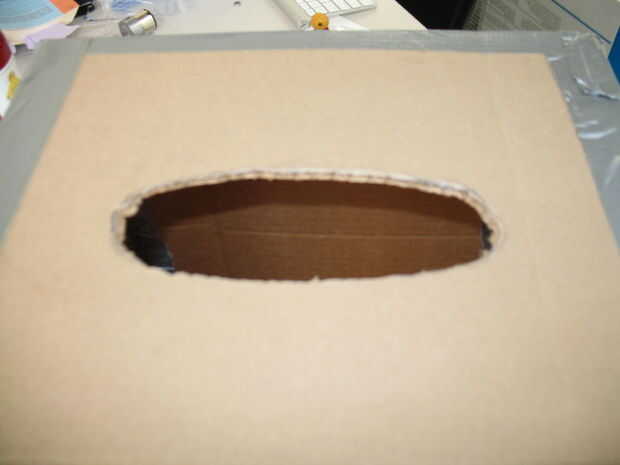 Para los ojos, cortar un óvalo en un lado la caja pequeña. Hice un óvalo con longitud de 5.5 pulgadas y altura 2,25 pulgadas de la parte superior del óvalo 4 pulgadas por debajo del borde de la caja de cartón. Cualquier variación en los ojos se puede utilizar, pero asegúrese de que se puede ver fuera de tus agujeros del ojo.