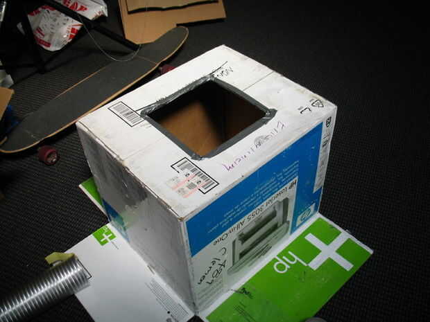 Para el cuello, corté un cuadrado fuera del lado de la caja grande que quería ser la parte superior. Corté un 10 pulgadas por 10 pulgadas cuadrado, o un área un poco más pequeño que el tamaño de mi caja para la cabeza.