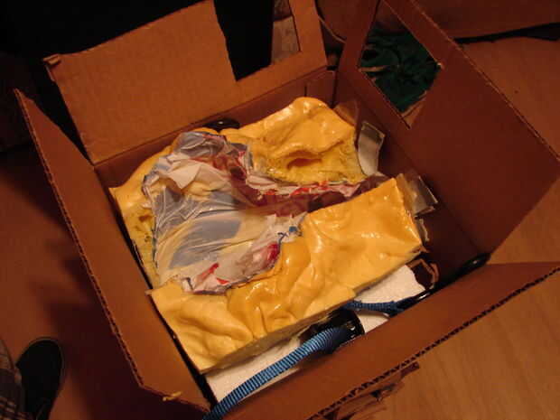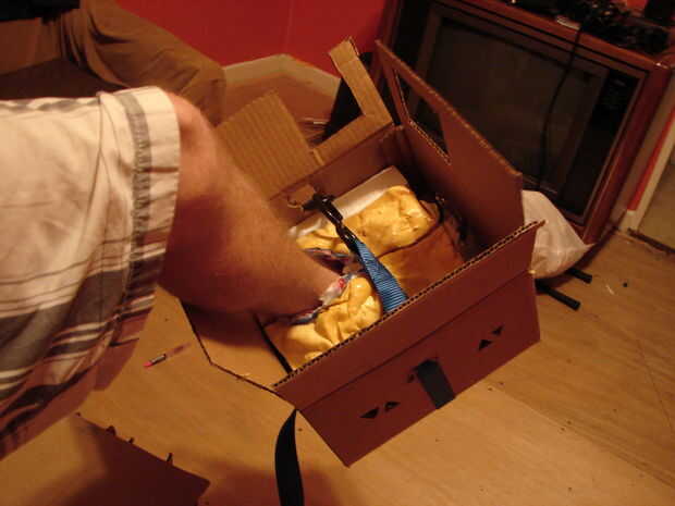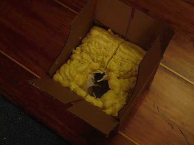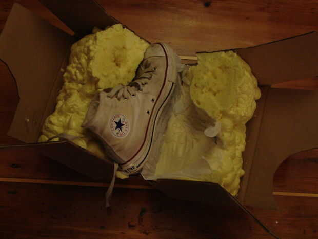 Para hacer el molde, sólo envuelve mi zapato (con el pie en ella) con una bolsa de compras, colocar mi pie en el centro de la caja y rociar grandes cosas alrededor de él. Si no estás familiarizado con cosas grandes, básicamente es una espuma de expansión utilizada para sellar grietas y agujeros en cimientos y tuberías etc.. Esperé hasta que la espuma había ampliado y secado (que tomó un poco, necesitan varias capas para llenar todo el espacio) y luego en el cuadro de línea recta por la mitad, dejando sólo la parte inferior de la caja intacta como una bisagra.