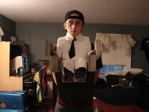 Empecé con un pedazo de cartón lo suficientemente grande como para cubrir mi pecho, luego cortar las "correas" que se envuelven alrededor de mi torso. Había frour las correas que se envuelven alrededor de mis lados debajo de mis brazos y dos que envuelve la parte superior de los hombros. Al final de estas correas eran pedazos de velcro, de modo que lo harían cumplir con todas para arriba sobre mi espalda y seguro a unos de otros.