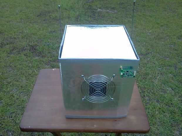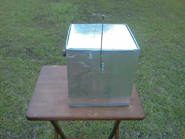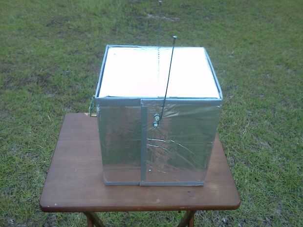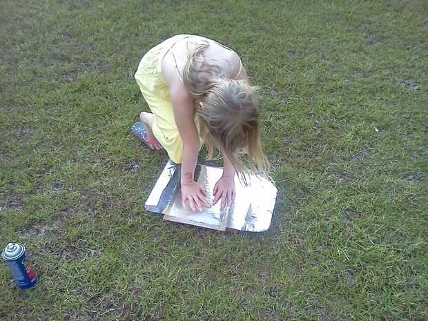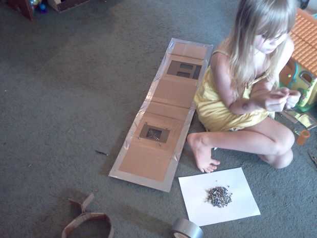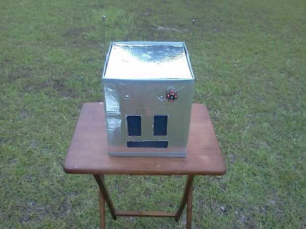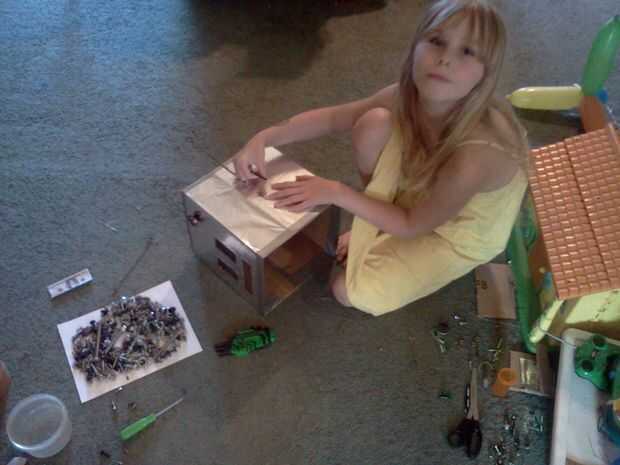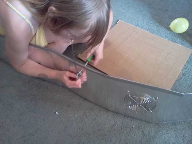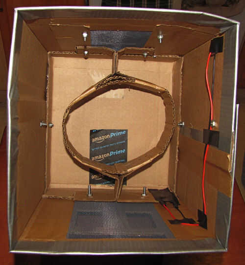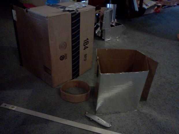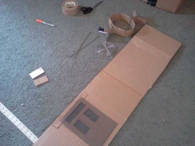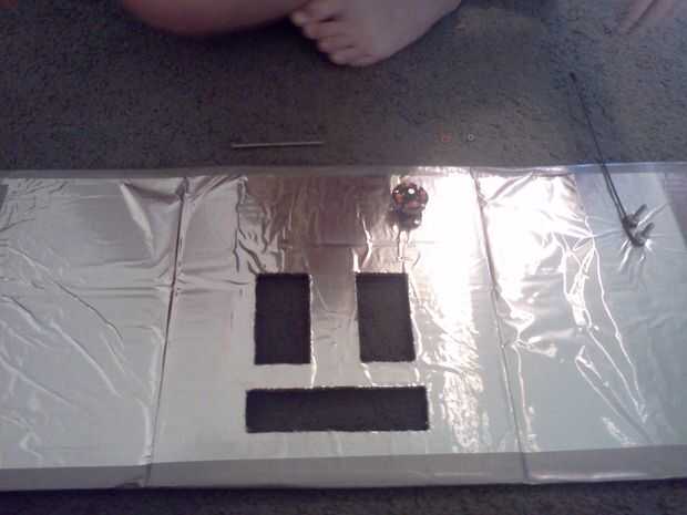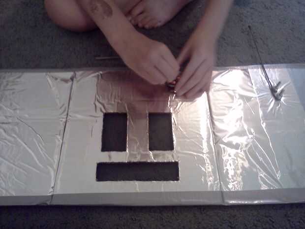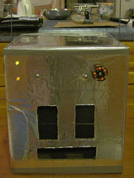 A continuación ella corta rectángulos para los ojos y la boca (iba para un bloque de estilo robot) y luego fue cortado un agujero en el panel que iba a ser la parte posterior de la cabeza, donde la parrilla fue a montarse. Usando la cinta de embalaje marrón, ella pegada abajo un pedazo de pantalla de aluminio con negro la ojos/boca y la apertura en la parte posterior de la cabeza. Finalmente, ella había perforado 4 agujeros alrededor del agujero en la parte posterior de la cabeza y utilizando 4 tuercas y tornillos pequeños adjunta la parrilla en su lugar.