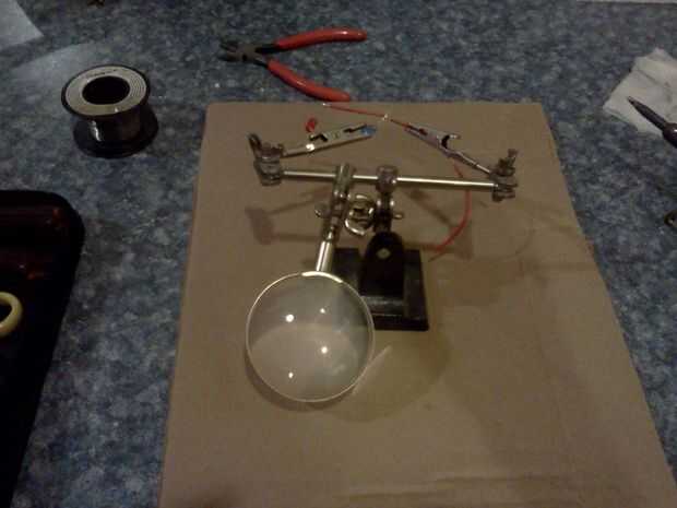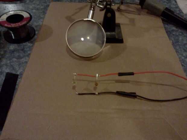 Por último, I había soldado rescatado un par LED juntos, asomó dos agujeros más en el frente de la cabeza cerca de la parte superior, montar el LED y funcionó los cables en la parte posterior de la cabeza y fuera del camino. Nos les funciona mediante el uso de una batería de botón único.