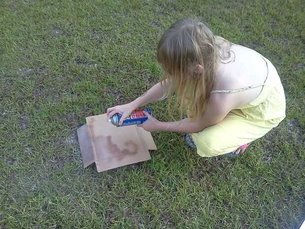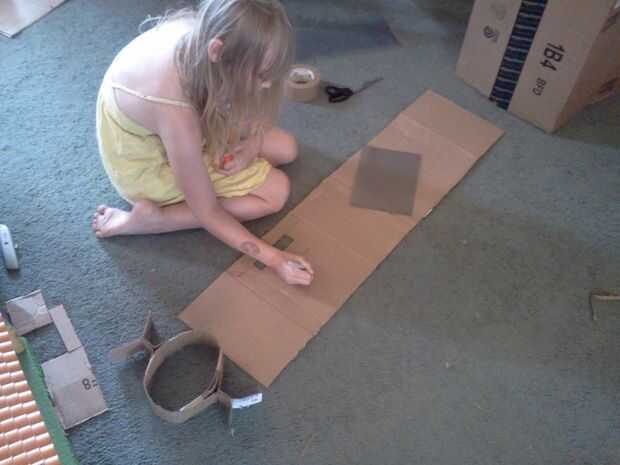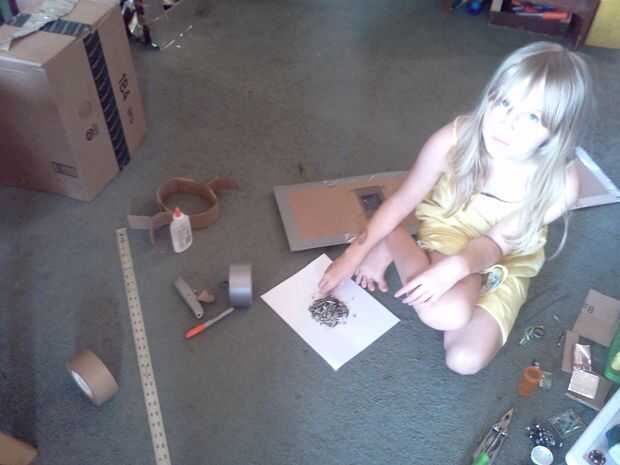 Para construir la cabeza, ella empezó con una caja del tablero de tarjeta más o menos el tamaño de su cabeza, pero un poco más grande. Antes de partir la costura en la caja hizo el soporte interno cortando una tira de cartulina que sería más pequeño que la parte superior de su cabeza cuando carpeta en un círculo (en forma de corona). A continuación, ella corta 2 6" rectángulos y corta 2 1" hendiduras en el centro, en ambos extremos. Ella entonces los dobla por la mitad y doblado de los extremos y con cinta de embalaje marrón, fijarse en la parte delantera y la parte posterior de la forma de la corona. Una vez que el tamaño de la ayuda dentro de la cabeza, ella había partido parece en la caja, de modo que podría poner plana. Luego estaba fuera, agregar pegamento spray y papel de aluminio a la cartulina.