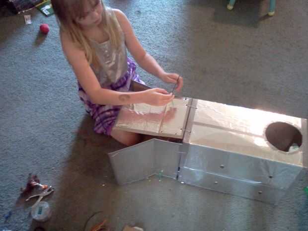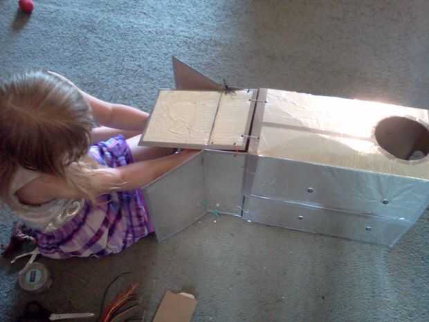 Por último, usar cables de computadora, Lucy había atado los paneles en el cuerpo de robots y luego juntos en las esquinas formando la falda.
