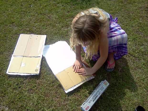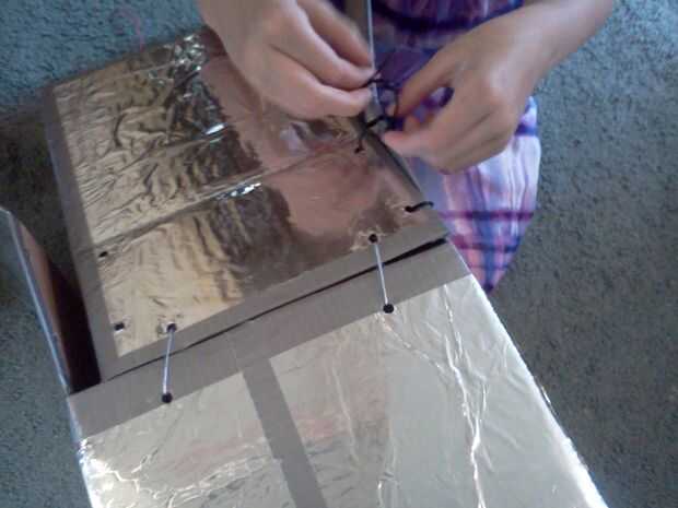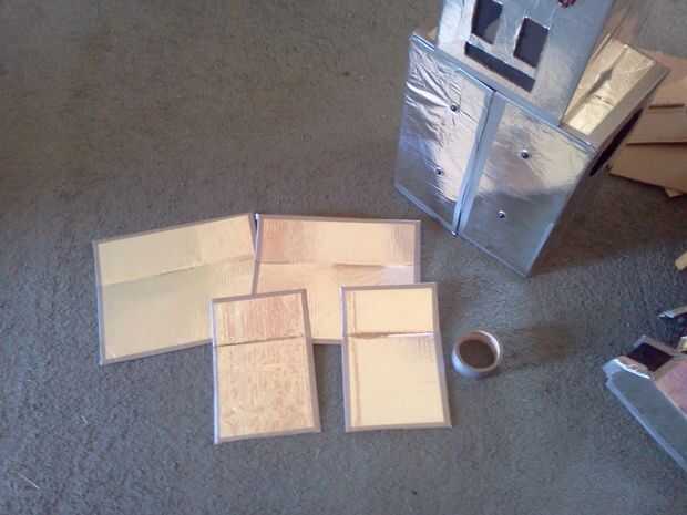 Para empezar, ella divide la costura en una 14 "x 8" x 4 "de la caja y cortar cada una de las secciones de uno al otro, salir de ella con 2 8" x 18" y 2 paneles 14" x 18"(incluyendo las aletas). Ella entonces recortar un lado de la aleta de salir de ella con 2 8 "x 11" y 14 "x 11" paneles de 2. A continuación fueron tomadas fuera de y cubiertos en pegamento de spray y luego papel aluminio. Una vez que los paneles se habían secado, se separaron y luego los bordes fueron grabados para protegerlos de daños.
