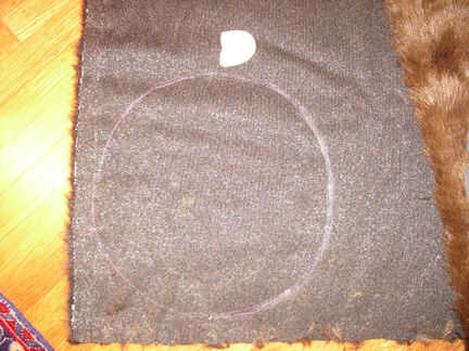 Como dije, no molesta en usar un patrón para la parte superior y los lados ya que son formas muy sencillas. Sólo colocar la Roomba en la piel de la falsificación y había remontado su borde con un trozo de jabón blanco. Jabón blanco (tiza pálido o plumas de gel de colores brillantes también funciona bien) es bueno para marcar tela oscura. Y allí tienes la parte superior del ratón.