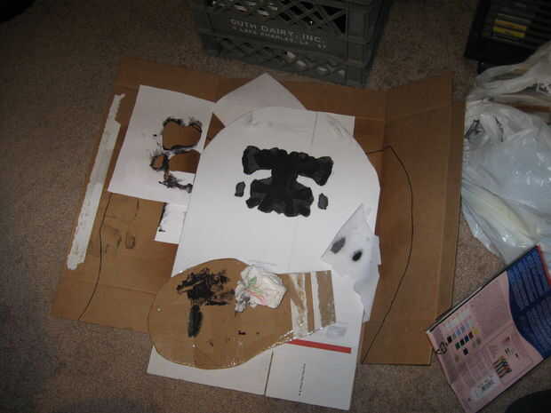 Para el segundo diseño de mancha de tinta, elegí uno que tenía una forma similar a la primera, pero era más grande y podría contener el primer diseño dentro de sí mismo. A continuación os pongo la plantilla en su lugar. Esta vez sólo pinté las zonas donde fue expuesto el blanco del material de la máscara. Esto fue porque el primer diseño siempre sería negro, así que no había ningún sentido de perder el color cambia la pintura. Me pintados a ambos lados del segundo diseño y deja secar por un tiempo.