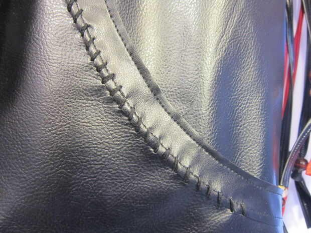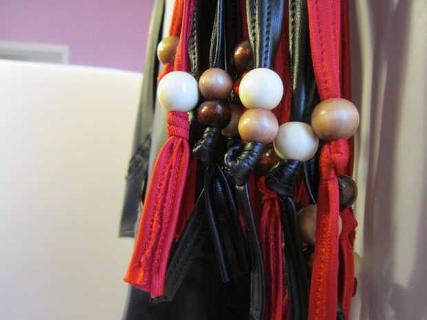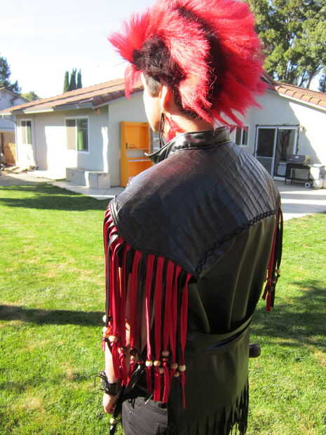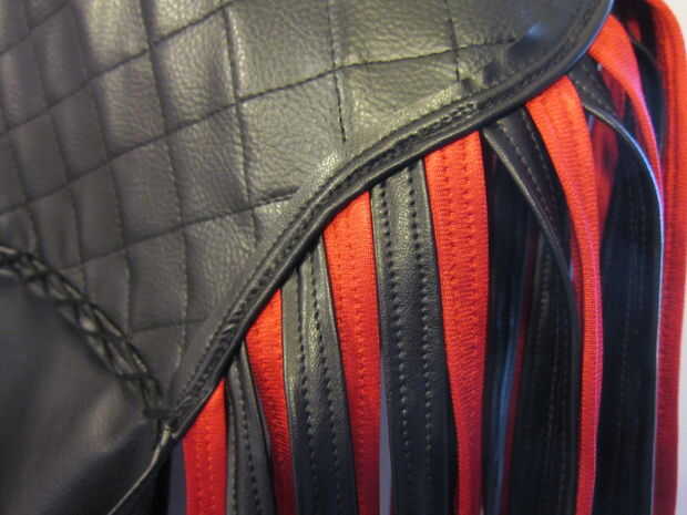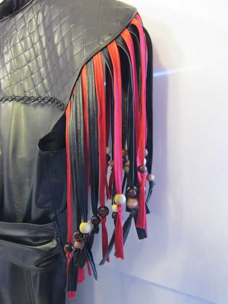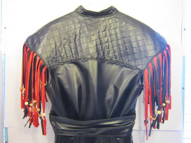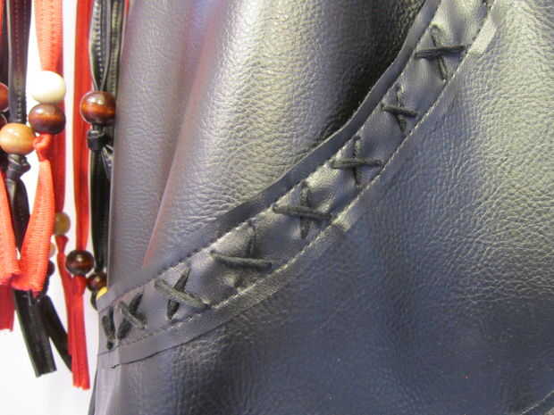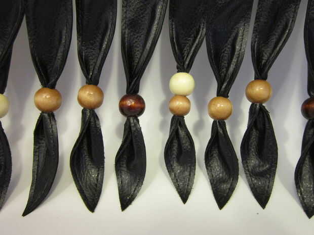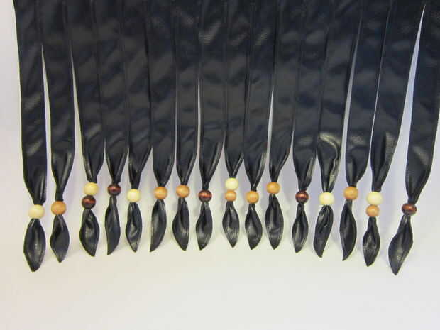 La "cola" posterior de la chaqueta está construida de 2 piezas de cuero del faux para el frente y atrás. Marcado las tiras de flecos con una regla y un lápiz de color blanco. Utilicé alfileres para mantener a la tela en su lugar mientras que topstitched la tela juntos. Utiliza tijeras para separar las piezas. Siguiente que he añadido los granos de madera a la franja que encajen firmemente y no requieren un nudo.