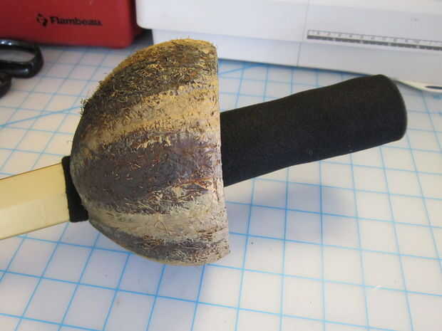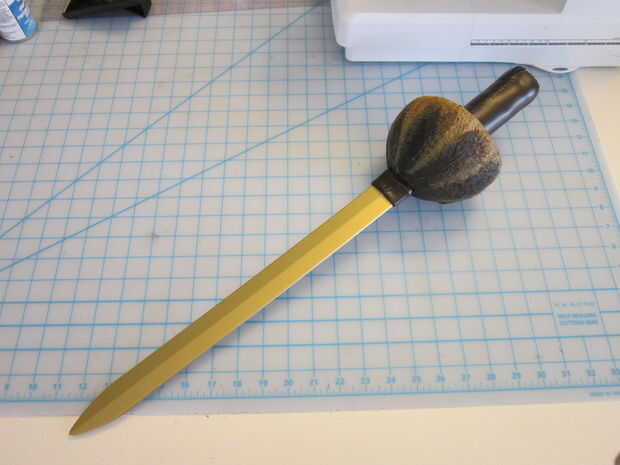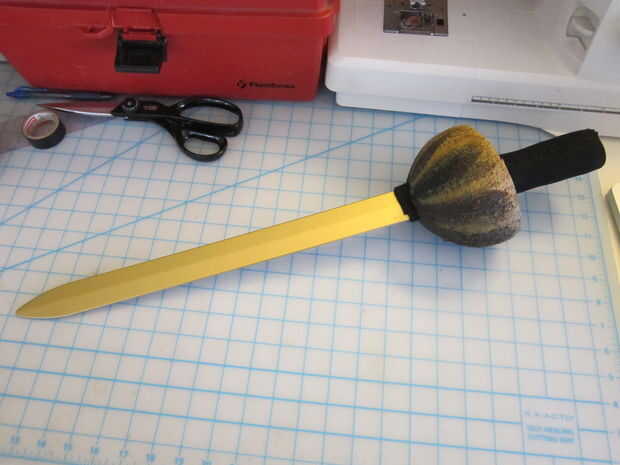 Cuando la espada y el coco eran completamente secos, inserta la espada en el coco. Envuelve la base de la hoja con una fina capa de fieltro por lo que cabe bien por la ranura. Luego envuelve el mango con una capa de espuma y había asegurado firmemente con cinta aislante.