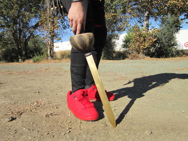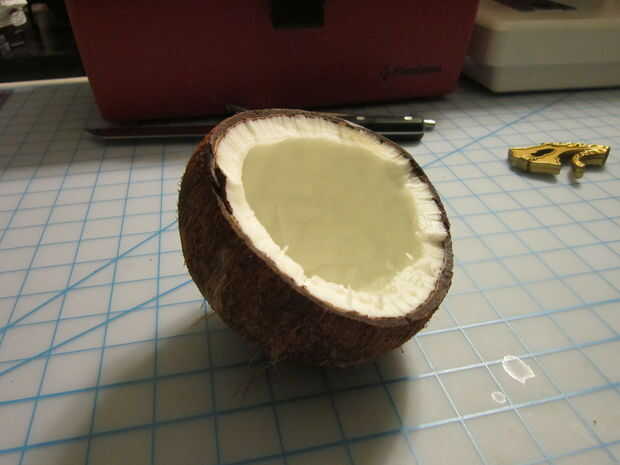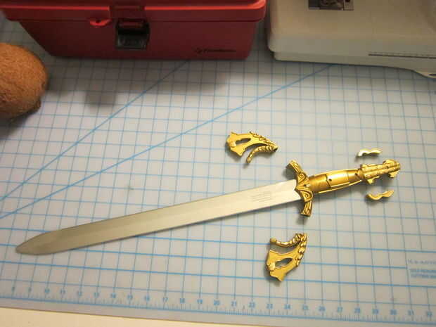 El mango de plástico de la espada era demasiado grande para caber dentro del coco, así que empecé por conseguir la espada en un tornillo de banco y corte el plástico sobrante con una sierra de mano.