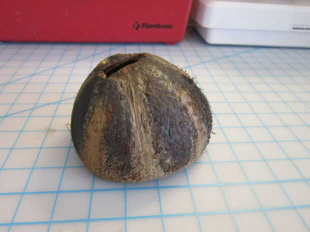 A continuación cortar una hendidura en la parte superior del coco para la hoja de la espada se deslice a través. He creado la ranura con una hoja de Serrucho; a partir del agujero que había creado para drenar la leche de coco.
