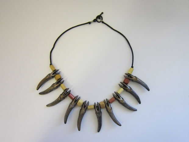 El collar de hueso fue creado usando ante cordones, cuentas de hueso, cuentas de madera y un cierre de palanca conectado por cable para cerrar. He añadido bronce pintura de aerosol a los granos de hueso para un aspecto envejecido.