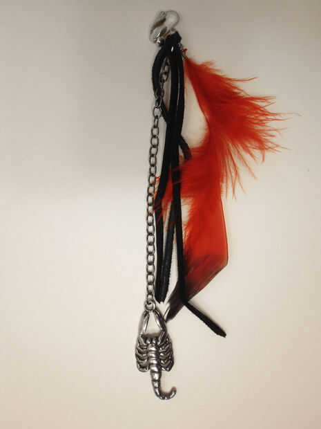 El pendiente fue creado usando un clip de oro pendiente, cordones de gamuza, una pluma roja, cadena de plata, y un escorpión encanto usando salto los anillos y alambre para sujetar.