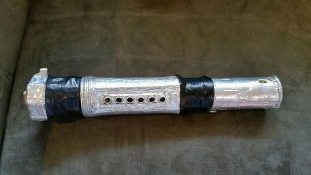 Herramientas: La cinta se recomiendan unas tijeras. Una sierra de arco para el PVC. Pistola de pegamento caliente se utiliza para asegurar las piezas de PVC para el metal, así como las piezas estéticas en la empuñadura. También puede usarse un pegamento más fuerte. Cemento de contacto es otro pegamento aceptable como el pegamento instantáneo que se puede comprar por cinco dólares.
