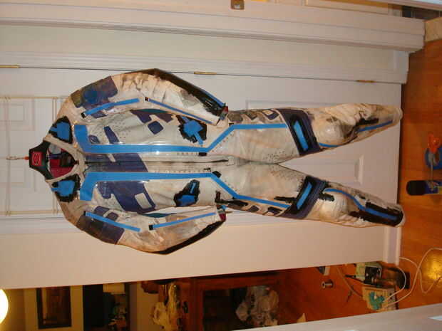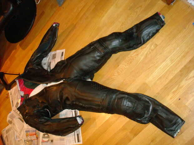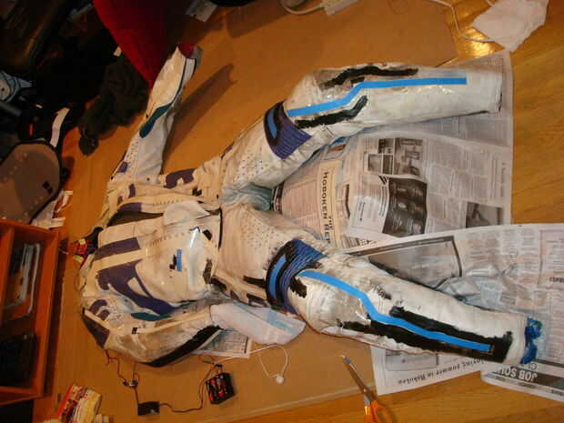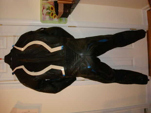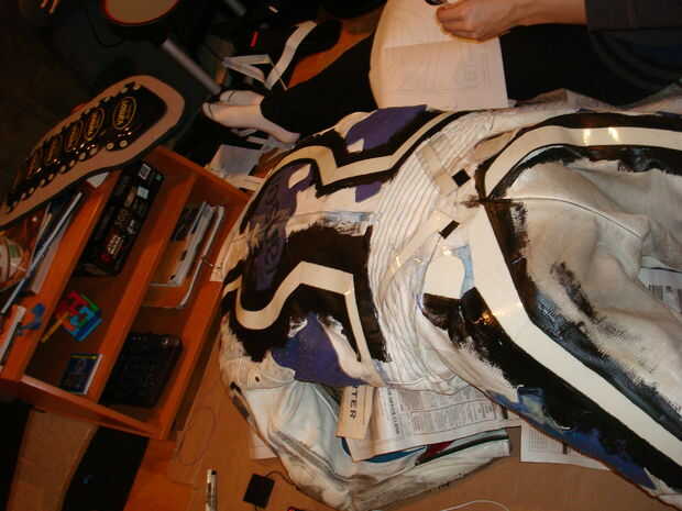 El resto del traje es una mezcla de una versión del spray de "Plasti Dip" para las piezas de cuero y pintura negro mate para las piezas de tela.