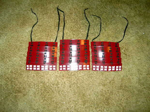 Kusazuri el es hecho de la misma manera que la armadura de Sode(shoulder) es. Esta vez las lames se hacen 2" de ancho y 6" de largo. He utilizado 5 lames para cada kusazuri y una armadura de samurai tenía ir todo el camino alrededor de la do. Opté por uno frontal y 2 laterales. Lo hizo más fácil para sentarse! Debe suspender aproximadamente 4" de la Do.