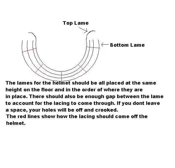 El shikoro (falda) se hizo casi lo mismo que los hombros y kusazuri. Sólo esta vez, queremos que las piezas mucho más tiempo así que vienen en el casco y apenas por debajo de la visera. La parte superior más cojos de la falda va a tener que tener 3" extra a cada lado para poder tener las piezas de la espalda curvadas que cascos samurai tradicional. Mientras realizas las lames, cada uno será más largo y el último para hacer la diferencia en circunferencia puesto que éstos se superpondrá. OK, lo tienes todo 4 lames curvas después de ejecutar tus franjas a través del agua caliente y refrigeración les. (Ayuda a mantener el casco en el contador así que usted puede juzgar cómo va a encajar) Antes de perforar estos y estas pintura, tienes que cuenta espacio del cordón. La imagen en MSpaint (yee-cómo!) muestra cómo. Después de marcar donde estarán sus cordones, tienes que alinear las marcas para cada línea perforarlos. Una vez que los agujeros perforados, ajuste la parte superior lame a su casco y marque el casco donde los orificios se alineen. Taladre los orificios en el casco donde los cordones fijan el shikoro al Kabuto. Cordones de la misma manera como el Sode (hombros) y Kusazuri (tramo superior) caliente algunos de los mejores cojo al Kabuto pegado por lo que los cordones no tienen que hacer todo el trabajo.