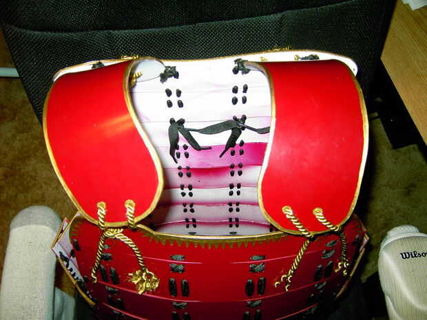 Sin embargo hay otra opción. Armadura samurai tradicional había conectado estas piezas a la watagami por lazos y frogs(wooden toggles). No quiero hacer todo eso aunque ya es bastante fácil de subir y bajar con hacia fuera los accesorios extras.
