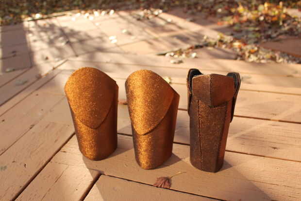 3. Dibuja la figura extra como se indica en el patrón y corte hacia fuera. Cubrir las piezas principales de tela y pegamento a la base forma manteniendo una forma circular (grabado mis bordes cerrados como el pegamento secado). Cubrir la pieza agregada en tela y pegamento a la superficie de sus bandas de brazo, encintado en lugar de como se secan. Añadir dos trozos de velcro para mantenerlos en su lugar.