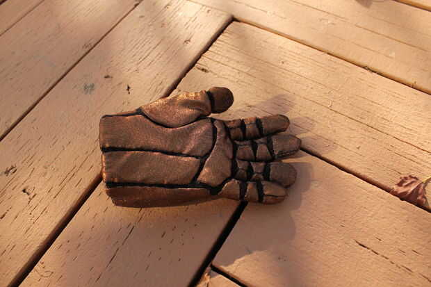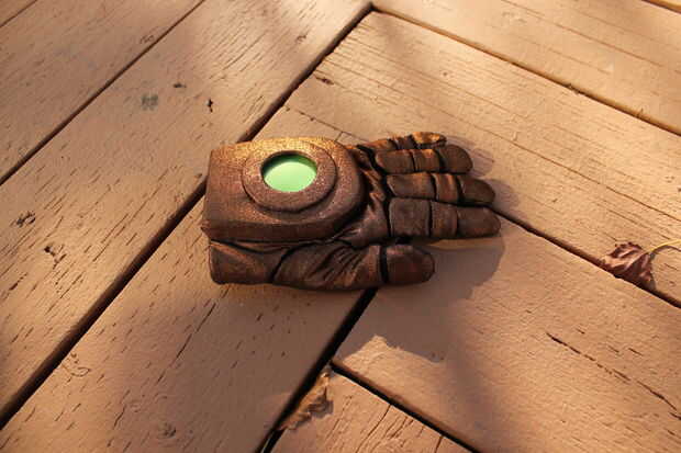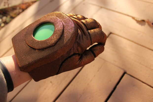 - Cortar una dona de espuma y cubierta en tela de la misma en cuanto a las piezas de la pierna. Usando pegamento Goop, esto adhiera bien al guante. Asegúrese de que se puede acceder fácilmente el botón de la luz para el guante. Mina puede ser presionado a través de la plástica. He creado una pequeña cubierta de cobre tela para ocultar el plástico negro del sistema de iluminación que he insertado.