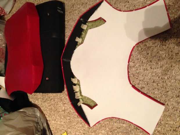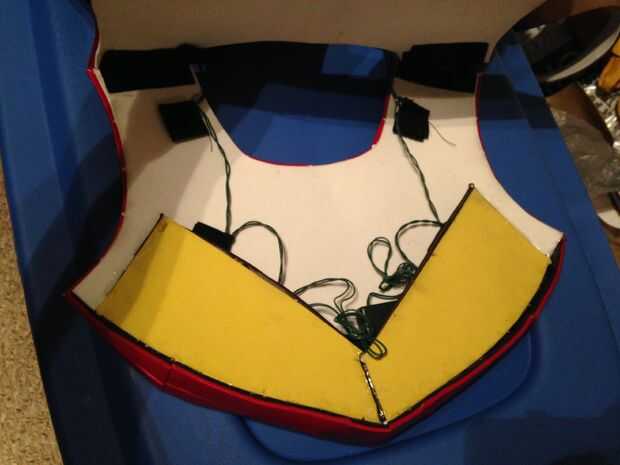 • El chestplate es conectado a la misma en los hombros como el "pañal". Un lado ha sentido conectar las dos piezas, y el otro con dos piezas de velcro. Más tarde se coloque velcro debajo de los hombros para sujetar las bolas del hombro y también en la parte inferior para colocar la iluminación.