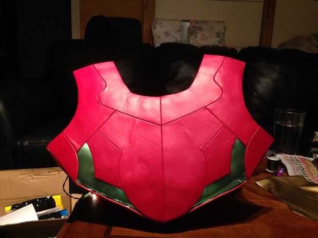 13. He creado una pieza posterior para los paquetes de baterías para sentarse en y para ayudar a evitar que la luz escape el chestplate. simplemente trazar la pieza que necesita usando un pedazo de papel y correspondencia a la curva inferior. Os adjunto una imagen para que pueda tomar una forma similar. Mina cubierto en tela verde y utiliza espuma extra como un forro (no podrás ver esta parte). Os adjunto velcro para mis baterías y velcro para el chestplate para alojarte todavía.