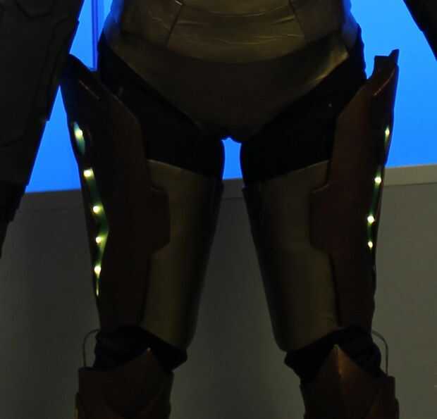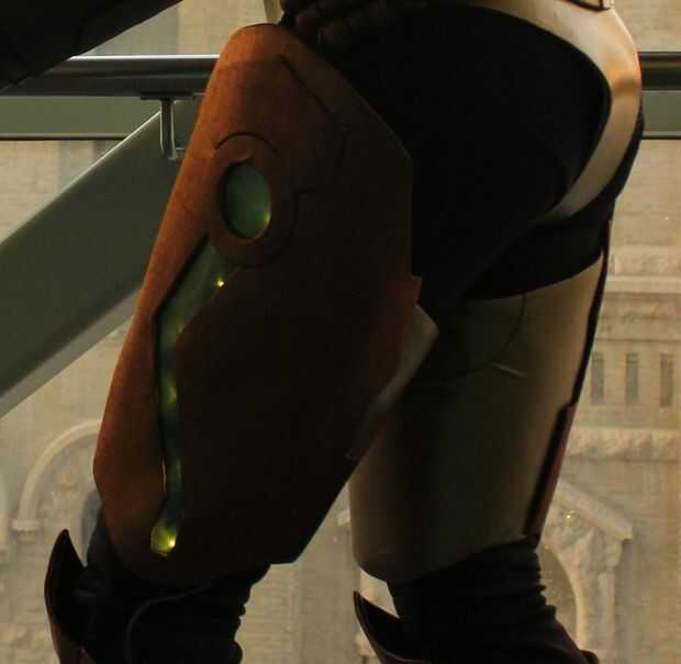 2. Extraer la forma necesito (han proporcionado fotos de referencia). La forma en la parte inferior es más alta en la parte delantera y trasera de las rodillas y más a los lados. El pedazo de muslo de oro es más alto en la parte delantera y trasera e inferior alrededor del lado. La pieza lateral cobre viene arriba. Debe buscar que su armadura podía unir del muslo para el "pañal" para darle ese look de robotic. Este muslo alto es también donde te esconden tus baterías. Hay dos "pestañas" en la parte posterior y uno en la parte delantera. Debe mover verticalmente hacia abajo la pierna en el centro.